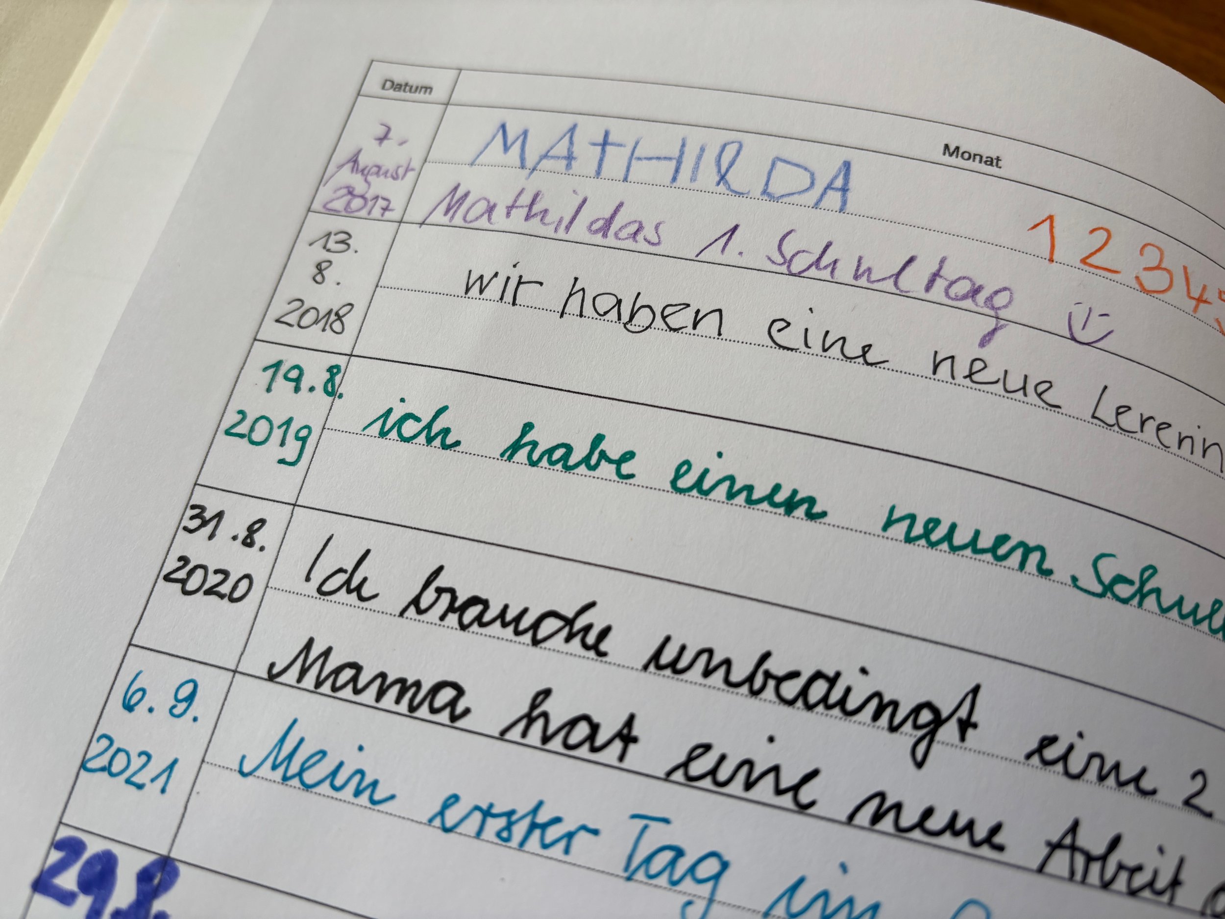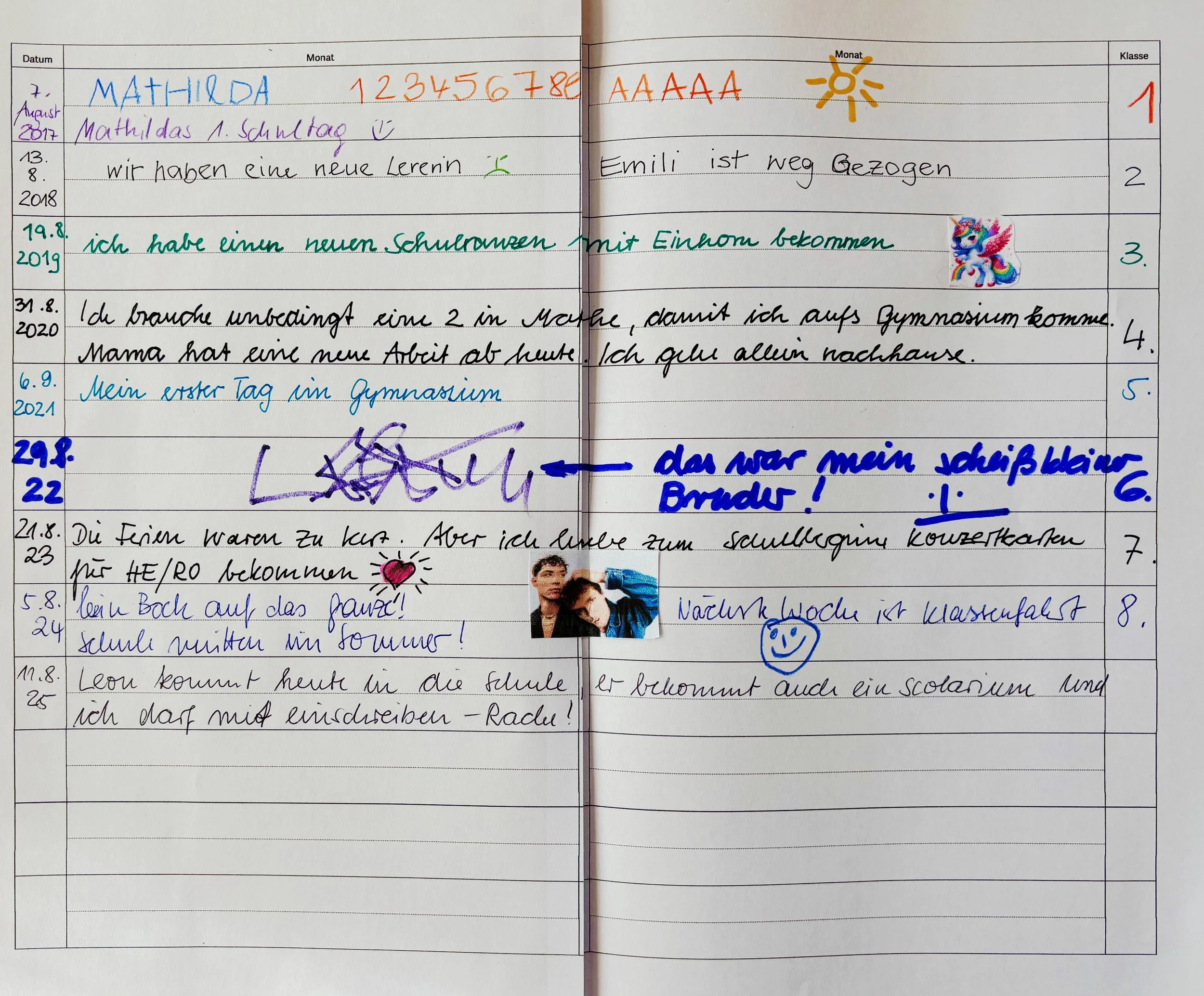 Jahreszeile für Jahreszeile füllt sich das Buch, bis zum Schulende das ganze Buch geschrieben ist. Eine Geschichte, meine Geschichte.