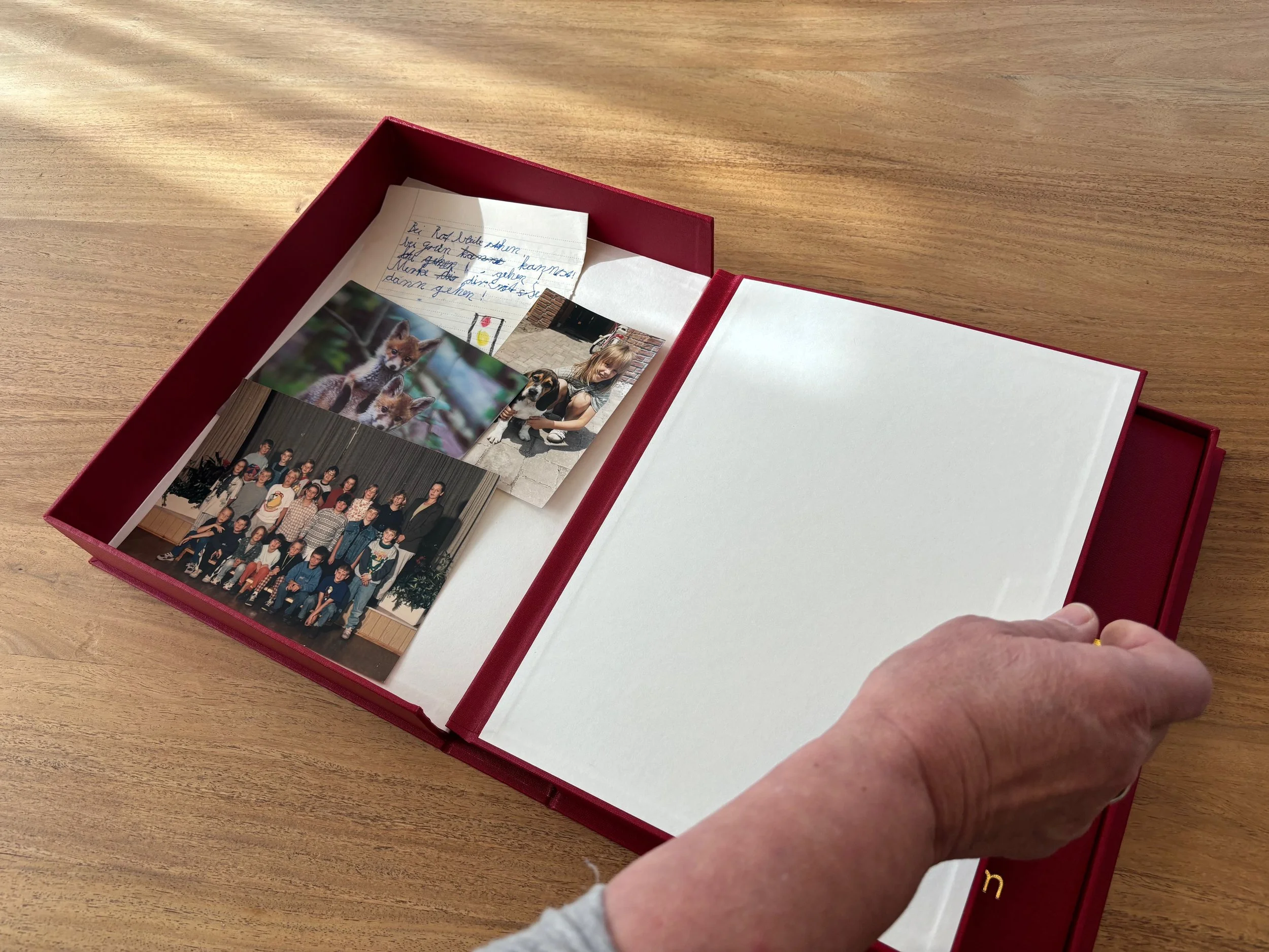Auf der linken Seite wartet das Sammelsurium: In diesem Kasten kann man die wichtigen Zeichnungen, Klassenfotos, Liebesbriefe, Aufsätze, Mathearbeiten, Fundstücke hineinlegen. Bis zum Format A4. Alles, worauf man stolz sein kann, alles, was man später wiederfinden möchte. Das Sammelsurium ist flexibel, es wächst mit.